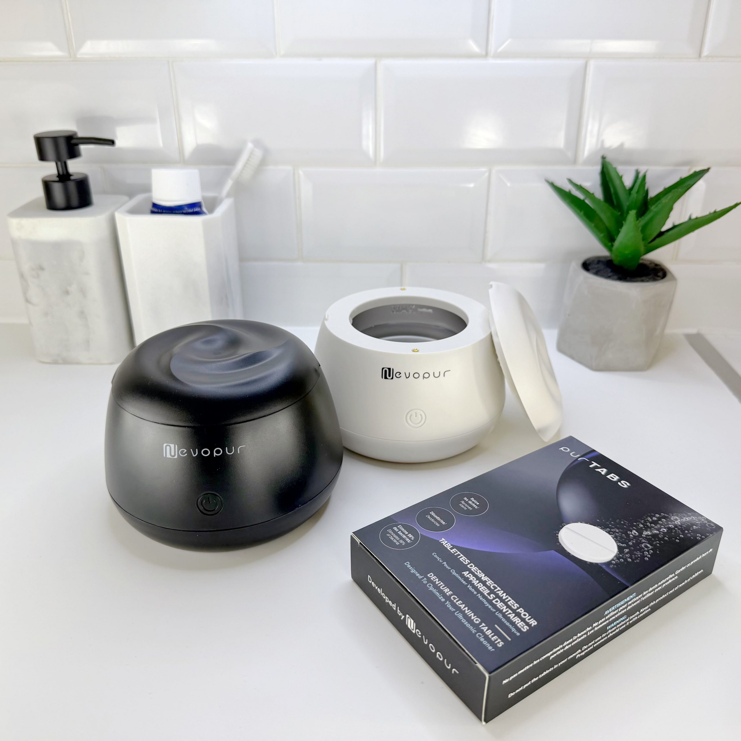 Il suffit de dissoudre un comprimé dans l’eau du réservoir de votre nettoyeur PurDental™, puis d’y plonger vos appareils dentaires. Lancez le cycle de nettoyage et profitez d’un résultat impeccable en seulement quelques minutes.